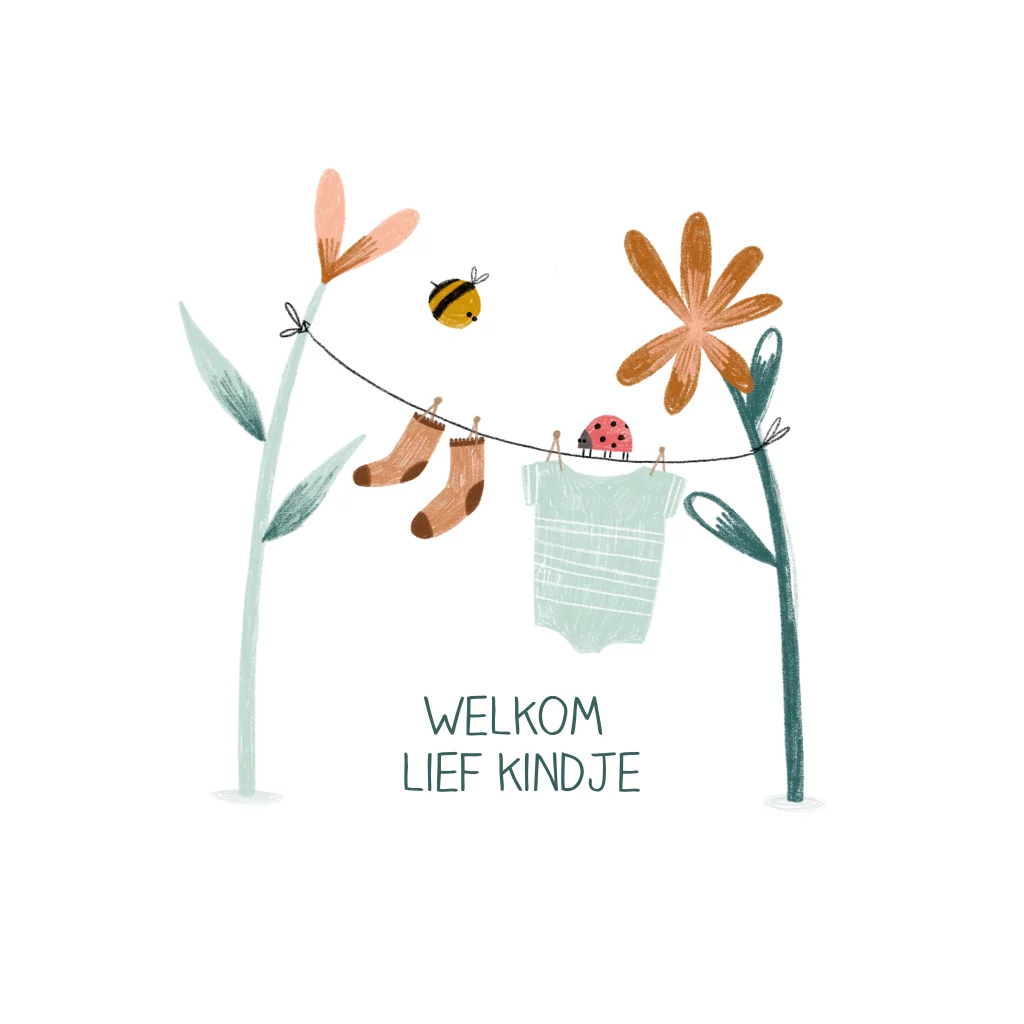 Een vrolijke wenskaart voor de geboorte van een nieuw kindje, met een waslijntje en gezellige diertjes.