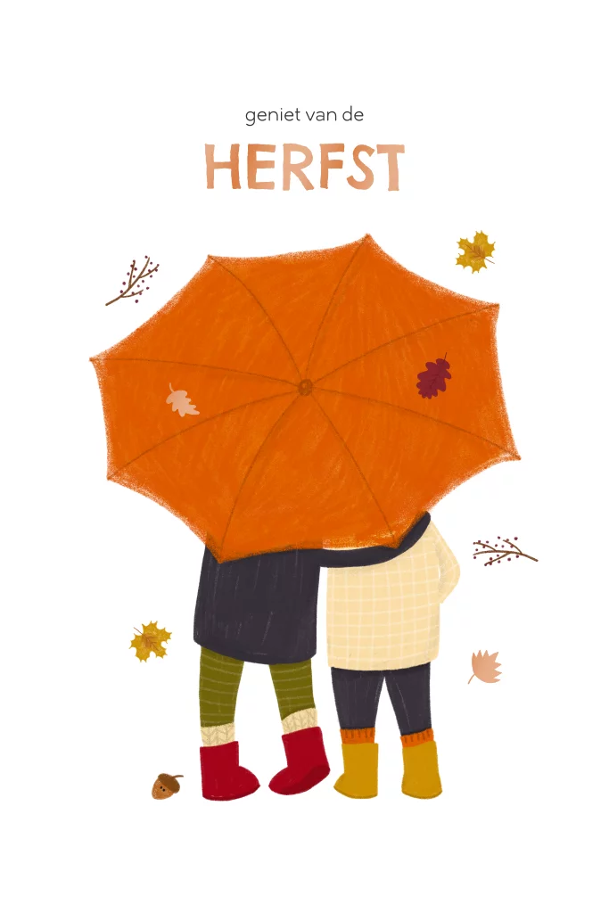 Een wenskaart om de herfst te vieren, met een illustratie van twee kindjes onder een grote paraplu met herfstblaadjes.