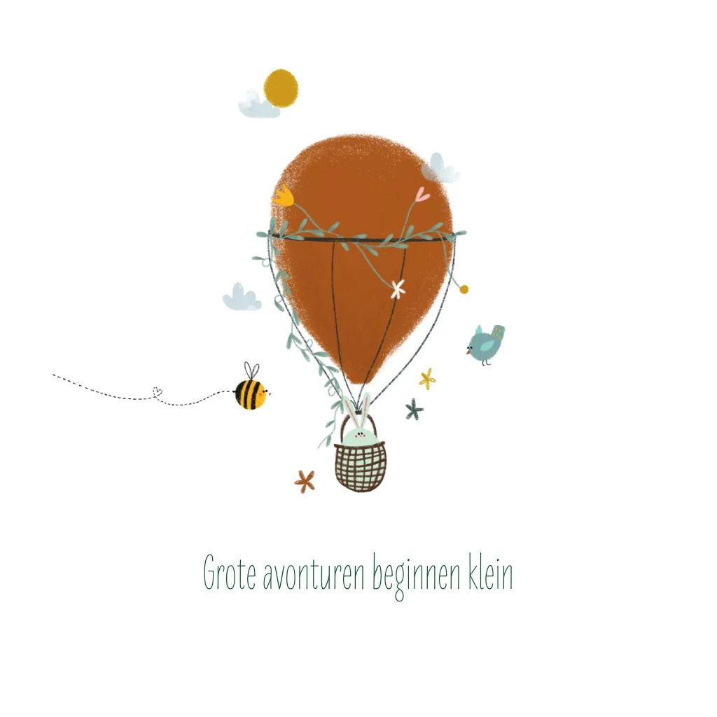 Een wenskaart voor een nieuw kindje op de wereld, met een konijntje in een luchtballon.
