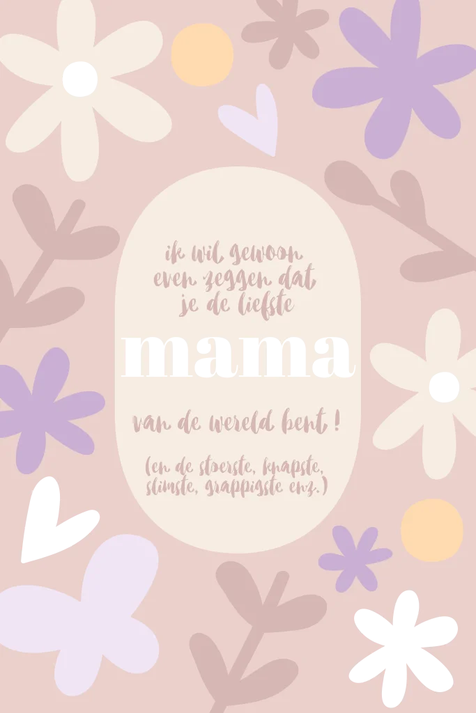 Een wenskaart voor moederdag om jouw moeder te laten zien dat ze echt de allerliefste is! Met hippe bloemen in roze en lila tinten, afgewerkt met koperfolie. Je kunt natuurlijk ook je eigen tekst op de voorkant typen!