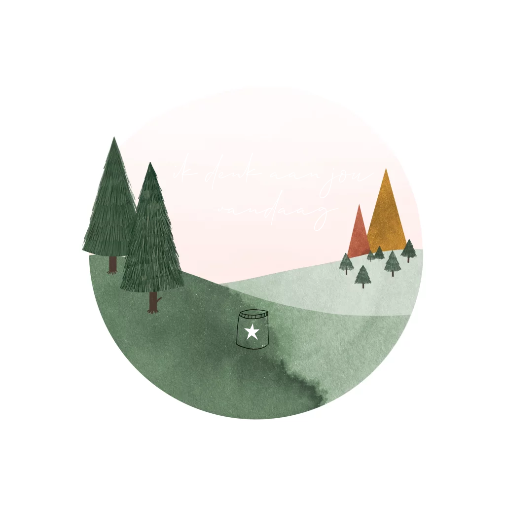 Een wenskaart voor een lieve moeder die een kindje heeft verloren. Met een waterverf illustratie van een landschap waar een klein potje met gouden sterretje in staat.