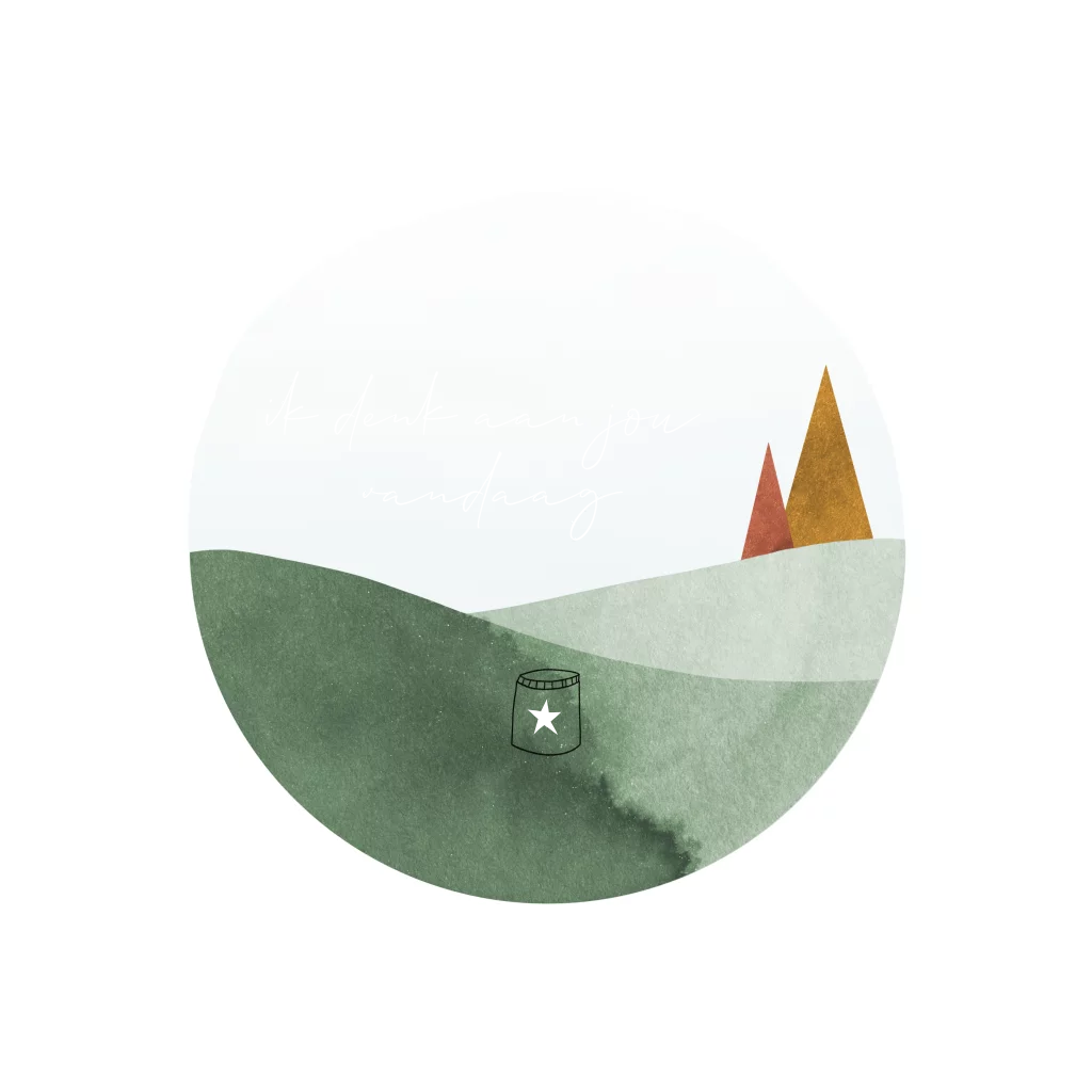 Een wenskaart voor een lieve vader die een kindje heeft verloren. Of misschien voor iemand die zijn/haar vader verloren heeft. Met een waterverf illustratie van een landschap waar een klein potje met gouden sterretje in staat.